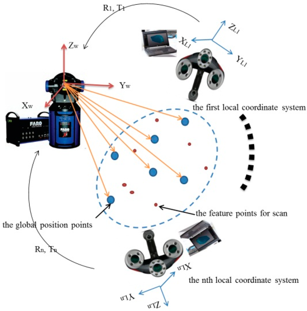 We assume that the laser tracker’s coordinate system is the global coordinate system, expressed by O-XWYWZW and the coordinate system of MAXscan is the local coordinate system O-XLYLZL. With the movement of MAXscan, the ith local coordinate system is expressed by O-XLiYLiZLi (i = 1, 2, 3 …, n).