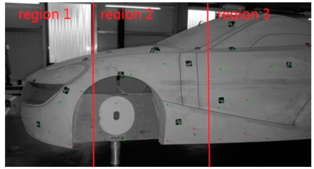 Compared with the total station, the theodolite and the digital photogrammetry system, the measurement accuracy of the laser tracker is higher, and the measurement range is larger. What’s more, the laser tracker is able to link multiple discontinuous partial regions of interest over a large volume into the global coordinate system. For example, the measured volume is so large that it will be separated into several small regions to decrease the accumulated errors in the scanning process. As shown in Figure 3, the bodyshell is divided into three regions. If we are only interested in region 1 and region 3, we just scan region 1 and region 3 and transform them into the global coordinate system with the laser tracker. The method will save a lot of time and improve the measurement efficiency. Therefore we adopt the laser tracker to position a global coordinate system for the handheld laser scanning sensor. A Faro Laser Tracker Xi was chosen for tracking the global position points as reference. Its Absolute Distance Meter (ADM) uncertainty is 10 µm + 1.1 × L µm/m, and the technical information has been verified by the National Metrology Institute of China (NIM CDjx2008-0782).