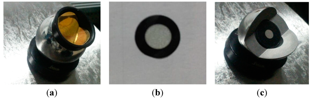 When both the sensors are locked onto the same target, integrating the 3-D measurements from different instruments in a global coordinate system is possible. These targets are the reference global position points. However, both instruments have their own specific targets. Wide-angle retro-reflectors known as Tooling Ball Reflectors (TBRs) are used as the probe of the laser tracker as illustrated in Figure 4a, whose centers are considered as the global position points. The retro-reflective targets (RRTs), as shown in Figure 4b, are pasted on the object to facilitate the simultaneous measurement of 3-D surface geometry and estimation of a model of positioning features for tracking, so we must solve the inconsistency. To measure the same physical features, the RRT pasted on the center of the 1.5-inch diameter half-sphere probe tip, which is the commercially available target, is used as shown in Figure 4c. It provides same centerline value as the TBR and it is used as a medium between laser tracker systems to optical scanning systems.