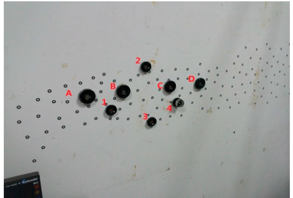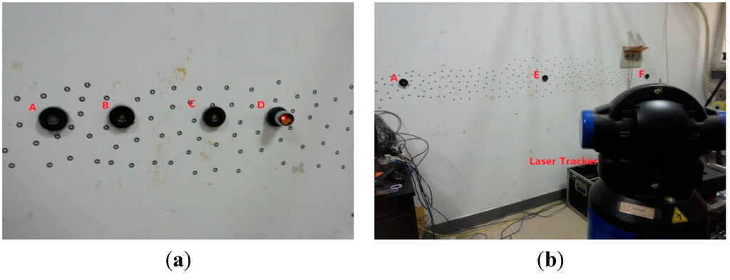 The standard should be of considerably higher accuracy than the measurement method being tested. As the laser tracker’s accuracy is higher than that of the combined method, we measure the coordinate of each point many times to calculate the distance between the points and the average of the distances is used as the standard value. For example, as shown in Figure 5a, four nests are glued to a concrete wall in the experiment and the coordinates are created using nests designed to accept a 1.5-inch TBR. At last, the standard values of AB, AC, and AD are obtained. Meanwhile, in Figure 5b, the standard values of AE and AF are also derived in the same manner. All the standard values are listed in Table 1.