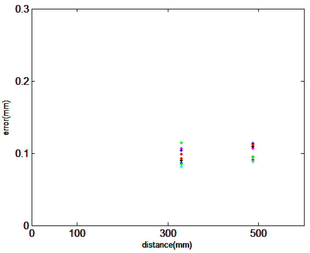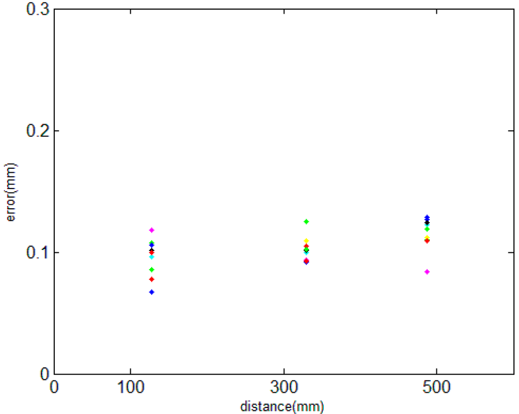 Firstly, we measure the length of AB, AC and AD only by the MAXscan. The corresponding error can be obtained by comparing it with the standard. This process is repeated 10 times. As seen from Figure 6, as the distance rises, the error grows. The change is not obvious due to the short distance.