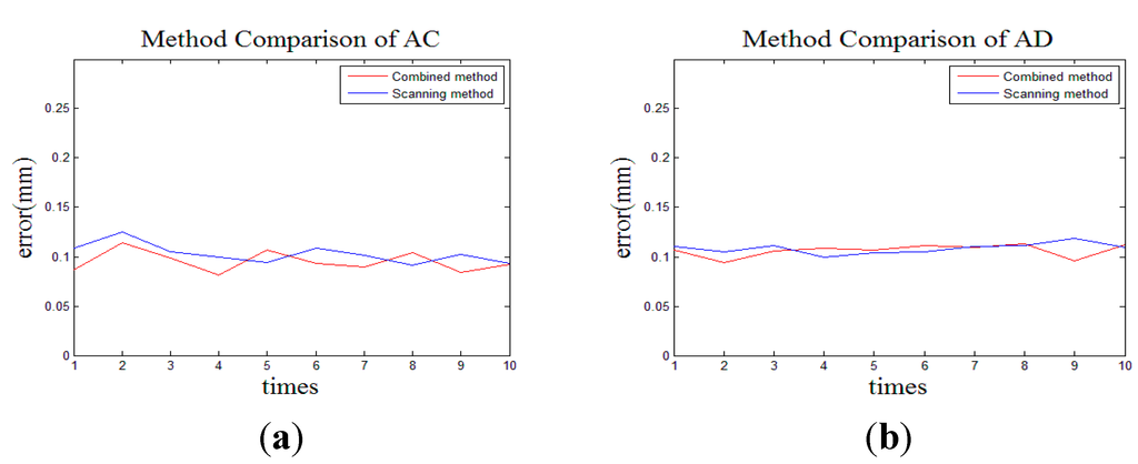 The error comparison by two methods: (a) The measured object is AC; (b) The measured object is AD.