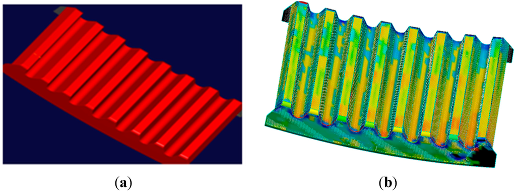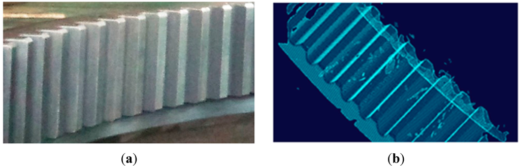 The gear rim’s radius is 1163 mm, length about 560 mm and width 220 mm. A total of 66,893 points are acquired by the proposed method, as shown in Figure 13b. Then, in order to derive the reconstructed model, a high-accuracy 3-D reconstruction method based on NURBS surface is adopted for data processing and surface reconstruction. In the surface reconstruction, NURBS is better able to control the degree of the curve than the traditional grid modeling approaches, such as Bezier, triangle-Bezier or B-spline, and thus it is commonly used to create a high fidelity model. What’s more, many applications involving CAD/CAM, virtual reality, animation and visualization use models described by NURBS surfaces. Over the last few years, they have become very important in industry, and they are used to represent shapes of automobiles, aeroplanes, ships, mechanical parts, etc. [20,21]. Therefore, in this paper, the 3-D solid model is reconstructed based on the NURBS surface, whose mathematical model can be expressed by:
