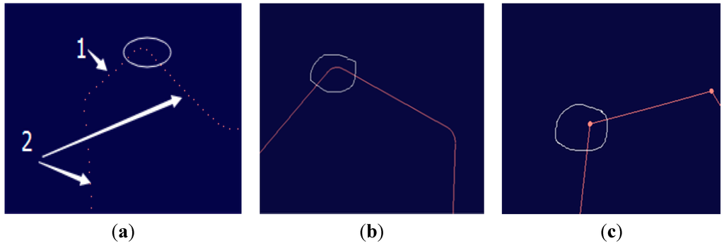 The fitting result comparison: (a) The point data; (b) The conventional method; (c) The proposed method.
