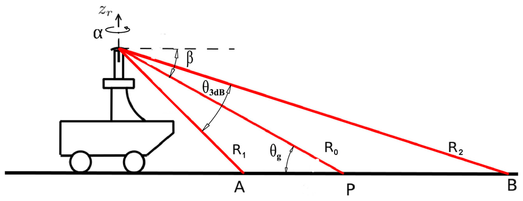 Keeping in mind the scheme of Figure 1, under the assumption of a pencil (narrow) beam and uniformly illuminated antenna, it is possible to describe the beam-pattern by a cone of aperture θ3dB, which is the half-power beam-width. The cone intersects the ground with a footprint delimited by the proximal and the distal border denoted as a and B, respectively R1 and R2 are the proximal and distal range, whereas R0 is the bore-sight range in which the peak of the radiation is concentrated. The angle of intersection between the bore-sight and ground is denoted by the grazing angle θg. Radar uses electromagnetic energy that is transmitted to and reflected from the reflecting object. The radar equation expresses this relationship. The received energy is a small fraction of the transmitted energy. Specifically, the received energy by the radar can be calculated as