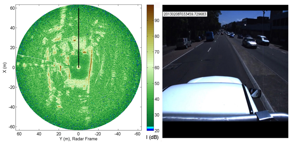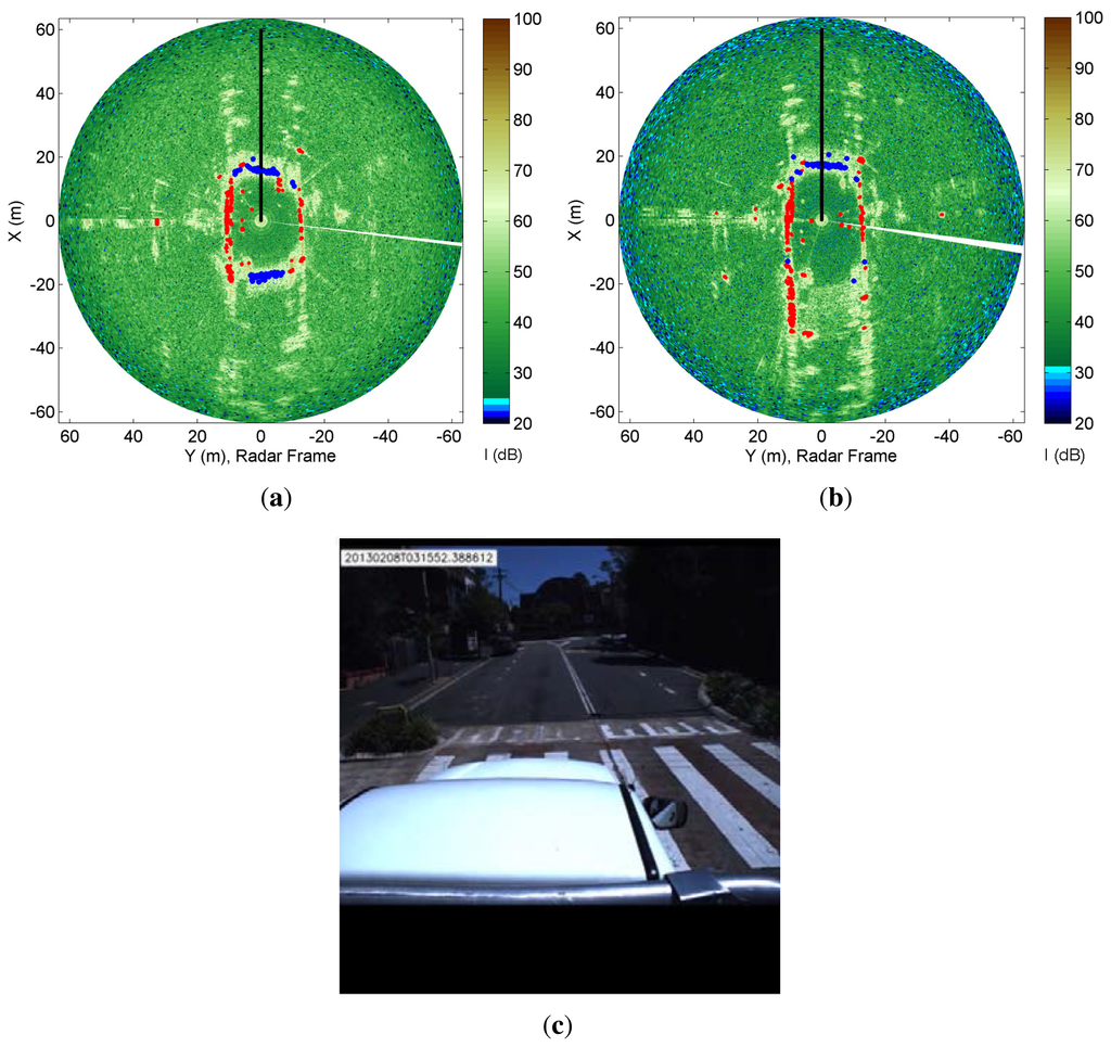 The test field is a path around the Redfern Campus (The University of Sydney, NSW, AU), and it is visible in Figure 9b. Along the path, the vehicle encountered various obstacles (cars, buildings, people), slopes and climbs. During the experiment, radar images were collected and stored for processing offline.