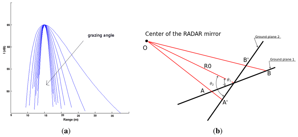 In order to evaluate the validity of the RCGD ground-echo model, Figure 3a shows the change of the model as a function of the grazing angle, whereas R0 is maintained constant. As the grazing angle increases, the RCGD ground-echo model becomes narrower and the range spread decreases. This is in line with Figure 3b; the first configuration denoted as ground plane 1 is characterised by the grazing angle θ1, whereas the second is denoted as ground plane 2 and it is characterised by the grazing angle θ2: θ2 > θ1, whereas R0 is the same for both configurations. It is apparent that the range spread (R2 − R1) for the first configuration (OB − OA) is higher than the range spread of the second configuration (OB′ − OA′). Indeed, increasing the grazing angle leads to a higher R1 (OA′ > OA) and a lower R2 (OB′ < OB).