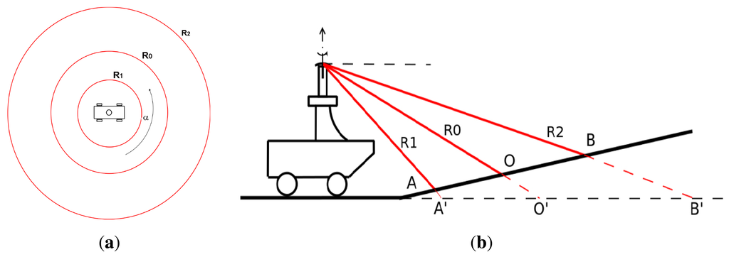 The first reason of failure is the presence of a climb or a descent or, more generally, when the ground plane is different from the plane of the vehicular motion. Figure 4b shows that the background location prediction of the RGS is A′O′B′, which differs from the real plane AOB.