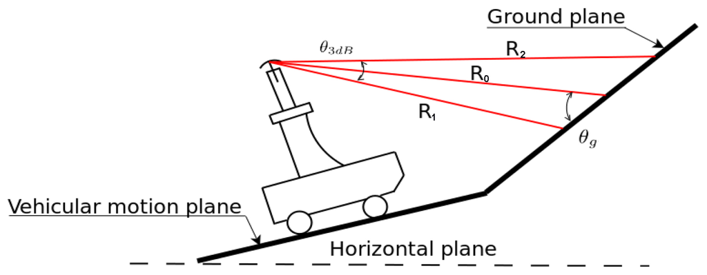 A novel ground detection algorithm, referred to as the RCGD algorithm, is presented that operates directly in the sensor frame of the radar, without the need for a separate synchronised navigation source or any geometric restriction of the area investigated. Let us refer to the general case where the plane of vehicular motion is not coincident with the ground plane in view of the radar. In addition, the two planes can be freely tilted in the space and no assumption is made about their location. These observations lead to the representation in Figure 5. Therefore, the main idea is that the ground-echo depends only on the information described by the sensor frame and the relative position between the bore-sight and the ground plane, defined by the grazing angle. This is suggested by Equation (5), which is theoretically independent of the navigation solution.