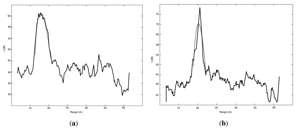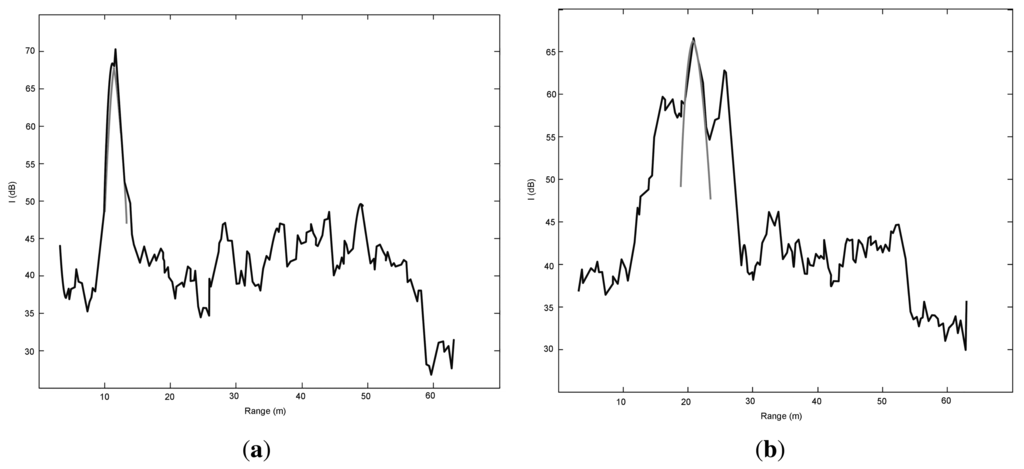 Finally, Figure 7b shows a second type of false positive, due to the simultaneous presence of ground and obstacle. The obstacle “attracts” the algorithm, which labels erroneously the observation as ground with an R0 equal to the peak of the obstacle signal. An additional check is effective in this occurrence. The range spread ΔR = (R2 − R1) of the RCGD ground echo model results narrower than that of the experimental data. Therefore, an observation is denoted as non-ground if its range spread is lower than a threshold, ΔRth, defined by inspection as will be explained in Section 4.2.