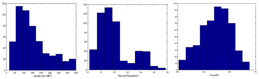 N observations were manually labelled by verifying against the corresponding frames provided by the camera. They were further divided into a training set of size M, which was used for setting the thresholds of the classification rules, and an independent group of size Q for evaluation, as will be explained later in Section 5. The squared error, range-spread ΔR, and values of the ground-labeled returns in the training set were stored and the results are illustrated in Figure 8. These plots show the variability of these parameters. They also demonstrate that no ground observation was detected with a squared error higher than 400 dB2, a range-spread less than 6 m and a higher than 68 dB. These values are the chosen thresholds for the classification rules of Table 1. The ΔP threshold was manually tuned by observing the resulting classified obstacles and a similar process of manual verification using the camera images as a reference. The threshold chosen was 3 dB.