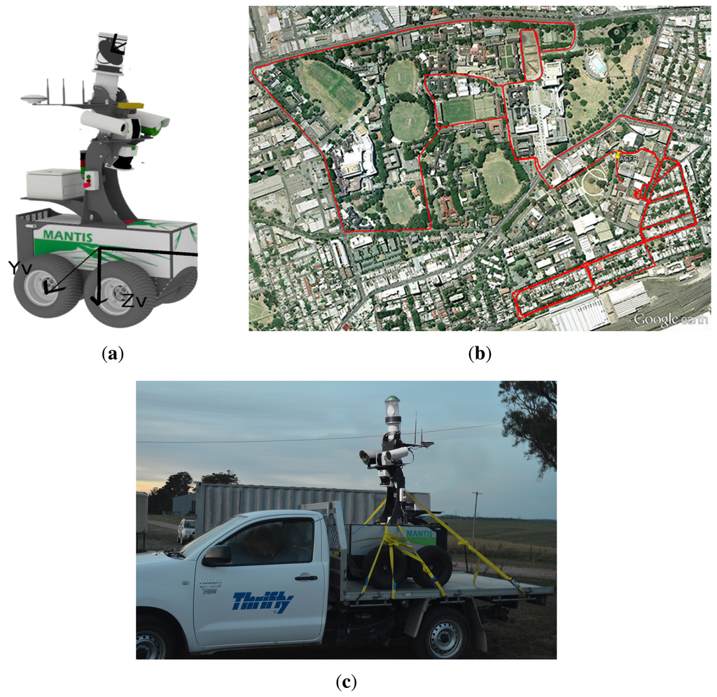 In this section, experimental results are presented to validate the RCGD algorithm. The system was tested in the field using Mantis (Figure 9a), a mobile platform fastened on a manned utility vehicle (Figure 9c). On the top of Mantis is mounted the HSS radar employed in this research. The sensor, custom built at the Australian Centre for Field Robotics (ACFR), is a 95 GHz frequency-modulated continuous wave (FMCW) radar that reports the amplitude of echoes at range between 1 and 60 m. The wavelength is λ = 3.16 mm and the 3-dB beam-width is 3° in azimuth. The antenna scans across the angular range of 360°. The main sensor properties are collected in Table 2. The robot is also equipped with other sensors, including one 2D Sick laser range-scanner, a colour camera, and a GPS/INS unit that provides pose estimation of the vehicle during the experiments.