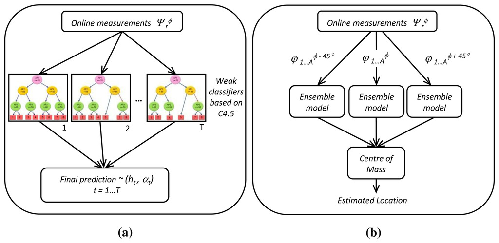 In our system, we use a weak classifier based on the C4.5 algorithm to generate a decision tree as a base model. Then, the adaptive boosting (AdaBoost) algorithm [27] is used to build an ensemble model based on previous base models, that is a model formed by multiple weighted decision trees is used to estimate the location. Experimental results demonstrated that this combination of machine learning techniques is the best for our test environment. Next, we will explain how the weak classifier and the ensemble model are generated.