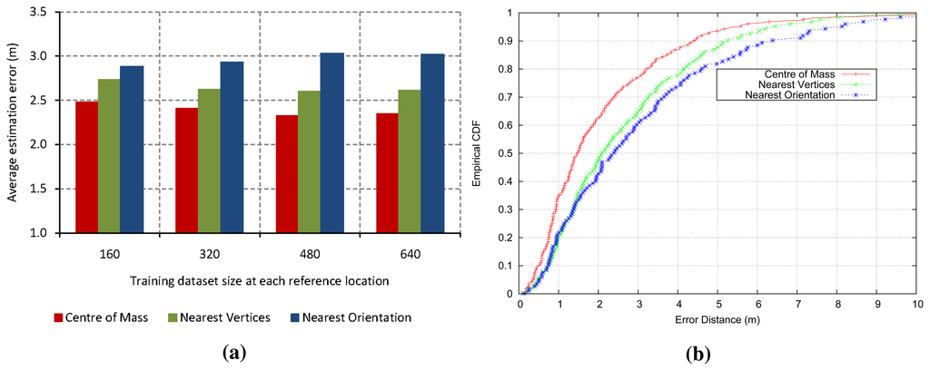 Figure 2a shows the average location estimation error for every experiment with regard to the training size at each reference point, which is computed as the arithmetic mean of several experiments. Eight different orientations (spacing 45°) were taken in 166 reference locations. Therefore, the total training dataset size is given by the multiplication of the samples collected at each orientation and location, the amount of different orientations and the number of reference locations. Figure 2b shows the cumulative distribution function (CDF) for each experiment. The error is the expected distance from the device's actual location to the predicted location. As we can see, the center of mass method achieves better accuracy than others, because it minimizes the high variability reported by the digital compass and, furthermore, provides a more robust and accurate approach. Hence, we proposed a test phase based on the centroid, that is the test phase of our localization system will evaluate the ensemble model of decision trees three times. After that, the center of mass of three predicted locations is calculated to obtain the coordinates of the final estimated position. Figure 1b shows the proposed system in the test phase.