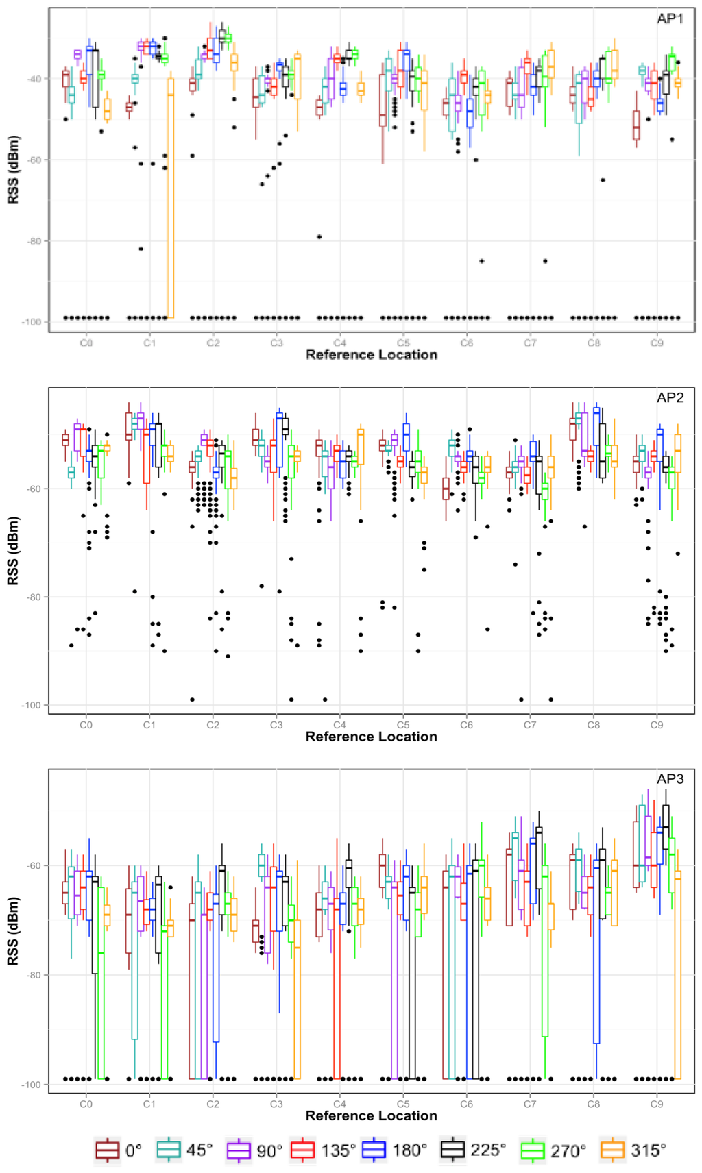 The data distribution for the first ten reference locations and for three access points is shown in Figure 4 in the form of boxplots. As can be observed, the RSS varies for each access point when changing the location and even for the same location when changing the orientation. For instance, in location C0 the highest RSS corresponds to AP1 when the device is facing south (180°), but facing northwest (315°), the RSS can be about 10 dB lower. The RSS variance with orientation does not have a similar behavior in all locations. For that reason, our approach uses a sensor fusion combining RSS and orientation, because this fusion yields an even more accurate system.