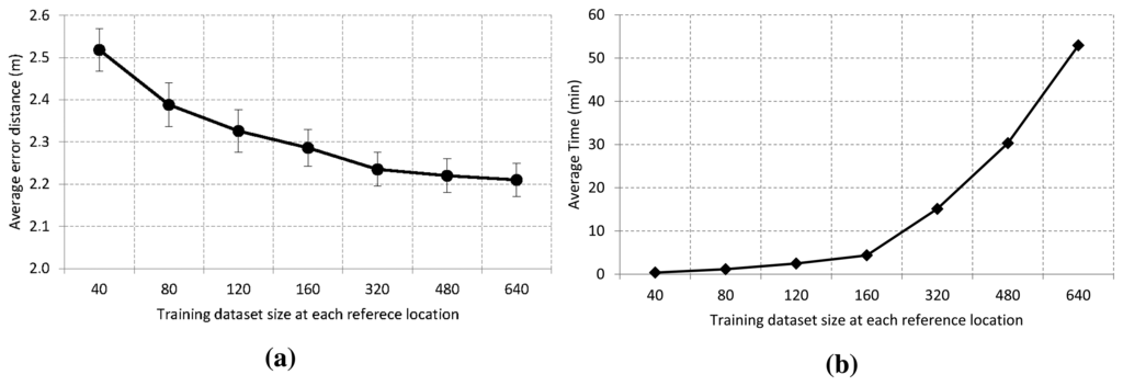 Figure 5a shows the effect of the training size at each reference location on error distance with a 95% confidence interval. As we can see, the ensemble model accuracy is enhanced as we increase the training size until it reaches a stable value. The average error is about 2.5 m when we use an ensemble model of decision trees based on 40 traces at each reference location. Furthermore, the accuracy improves around 10 cm if the training size is increased from 40 to 80. After that, there is a slight improvement for sizes of 120, 160 and 320 traces. Then, the accuracy remains approximately stable at about 2.2 m when the size is increased to 480 and 640 traces. The low confidence interval, ±0.045, is related to the reliability of the estimation procedure.
