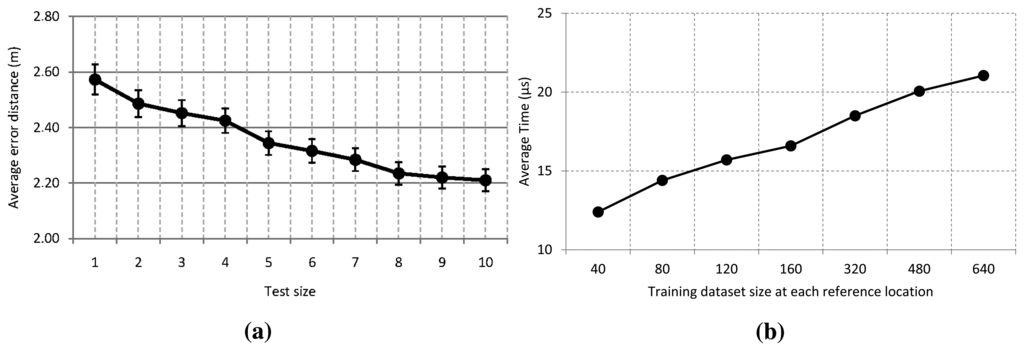 With regard to the elapsed time to get a prediction, we did not evaluate the test size, because this only implies calculating the arithmetic mean of a set of consecutive samples. For that reason and because it has a better accuracy, we use 10 consecutive measurements as a test size for most of our experiments, and the arithmetic mean of these is used as input. Figure 6b shows the elapsed time to get a prediction in our location system with a test size of 10, where we have varied the training size at each reference location between 40 and 640 traces. As expected, the elapsed time to get a prediction increases with the training sample size. Nevertheless, this not meaningful, because it only varies nine microseconds from the smaller to larger size of the dataset. This is because the depth of the tree grows slightly with the training size, and some more comparisons have to be made at each decision tree.