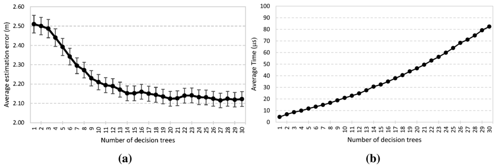 As mentioned in Section 2.2, the ensemble model is built with T weighted decision trees. When more decision trees are used, the proposed system can be more robust. Figure 7a,b reports the accuracy performance and the elapsed time to determine a location when the number of decision trees changes. It is demonstrated that arithmetic mean error decreases as T increases (Expression 7). When the number of decision trees is increased from 1 to 10, a significant performance improvement can be observed. However, the improvement fades away gradually when the number of decision trees used is larger than 11. Furthermore, in the case of a larger T, the proposed system generates more stable average errors for localization, reaching the minimum value several times, 2.1 m with T = 20, 21, 27, 29 and 30. Furthermore, a 95% confidence interval is shown. The confidence interval decreases as T increases, with the minimum value being about ±0.038. On the other hand, from Figure 7b, the results demonstrate a trade-off between the online computation and accuracy. The average time to determine a location increases linearly as T does. Nevertheless, it only involves an increase in the number of comparisons, and therefore, the computational complexity remains O(1) regardless of T. In the worst case scenario, it is an order of magnitude of microseconds and is faster than other positioning systems, as will be shown in the next section.