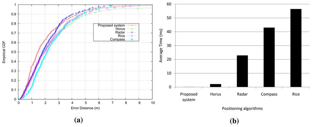 With regard to the elapsed time to get a prediction in each positioning system, our approach is faster than other algorithms because our approach uses decision trees to predict the location, which only requires comparison operations when walking along the tree. However, the rest of the positioning systems require the multiplication of conditional probabilities in proportion to the number of access points at each reference location. Only the Horus system reduces the number of multiplications, because it uses a clustering technique to group reference locations based on the access points covering them. The results are summarized in Figure 8b. The time elapsed by the other algorithms is measured in milliseconds, and the Horus system is the fastest of them, with an average time of 2.2 ms. Nevertheless, our localization system takes an average time of about 21 µs at worst from Figure 6b. Hence, the proposed system is about 100-times faster than Horus, and it is more than 1000-times faster than the other positioning algorithms.