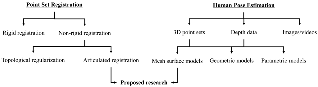 We provide a brief overview of the background of this research, which involves two separate, but related topics: point set registration and human pose estimation, as shown in Figure 1. Particularly, we focus on the recent research on human pose estimation from depth data, which has many practical applications due to the recent development of RGB-D cameras and other affordable range sensors.