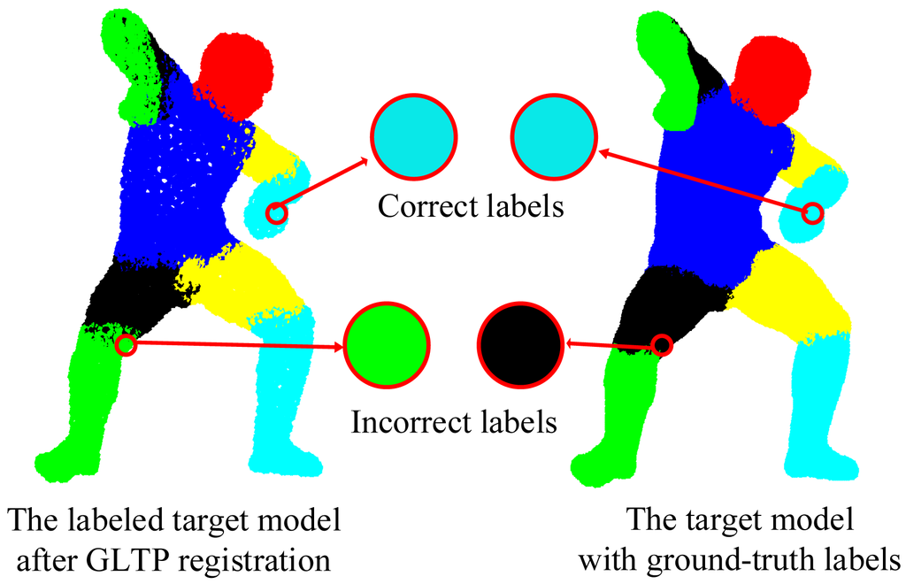We validate the proposed framework on 38 target poses from the SCAPE dataset, most of which have strong non-rigid articulation compared with the template, which makes it a challenging test set. In this case, visible point extraction and segment volume validation are not involved. Since the template and target models are captured from different subjects and also have different numbers of points, it is difficult to obtain the ground-truth correspondences. Thus, a quantitative result in terms of registration error is not available in this experiment. Instead, we use the accuracy of body segment labeling to evaluate the registration performance. During data preparation, we have obtained the ground-truth segment labels for all target poses. For each point in the template model, we propagate its segment label to the corresponding point in the target model by the estimated correspondence. If this assigned segment label is the same as the ground-truth label, we treat it as the correct segment label, as shown in Figure 10. Then, the labeling accuracy for each target pose is calculated as the percentage of the points with correct segment labels over all labeled points.