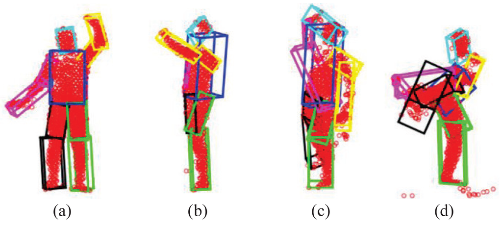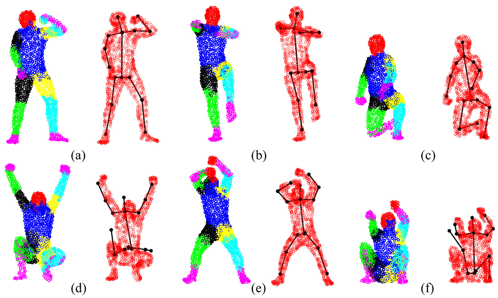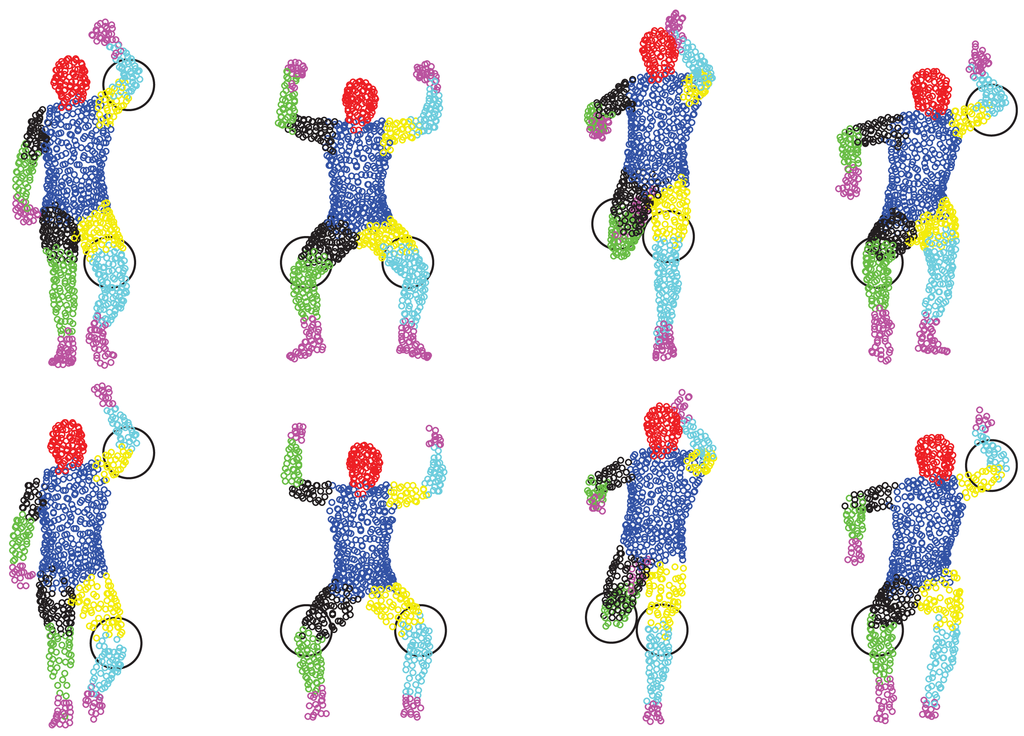 The GLTP registration algorithm, which initializes the correspondences for SAICP-based articulated pose estimation, plays a critical role in the whole flow. Since GLTP uses the Euclidean distance to assign correspondences, it may not be reliable or valid in two challenging cases. First, when there is a strong pose articulation in the point set compared with the standard “T-pose” template, the EM-based GLTP optimization could be trapped into local minima, resulting in some body segments being wrongly labeled, which might be corrected by SAICP during pose estimation. Second, when some body segments are too close (the head and hands) or even merged (lower/upper legs), the shortest distance is no longer valid in those segments, leading to wrong correspondence estimation, which can only be partially corrected by SAICP due to large labeling errors. We further show six challenging cases in Figure 16, where the first row shows three examples of the first case and the second row presents three examples of the second case.
