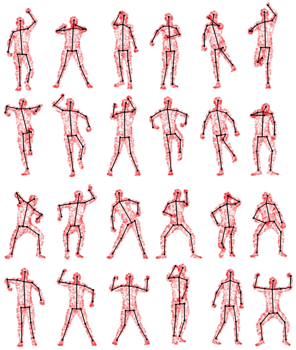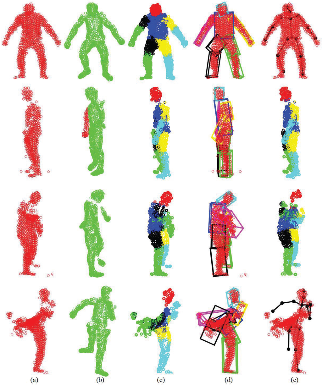 Human pose estimation is an important research topic in the field of computer vision and pattern recognition, which has been actively studied for decades [1]. In recent years, with the rapid development of various 3D sensing technologies, such as laser scanners and the affordable RGB-D depth sensors (e.g., Kinect from Microsoft), human pose estimation is attracting more and more attention lately [2,3] due to its wide applications (e.g., digital entertainment [4] and medical diagnostics [5–8]). Although significant progress has been obtained by recent endeavors, human pose estimation from 3D point sets or depth data remains a challenging problem due to several factors, such as the high degree-of-freedom (DoF) of pose parameters, large pose variation, complex motion patterns, body shape variability and imperfect sensor data (noise, outliers, incomplete date caused by self-occlusions and view changes).