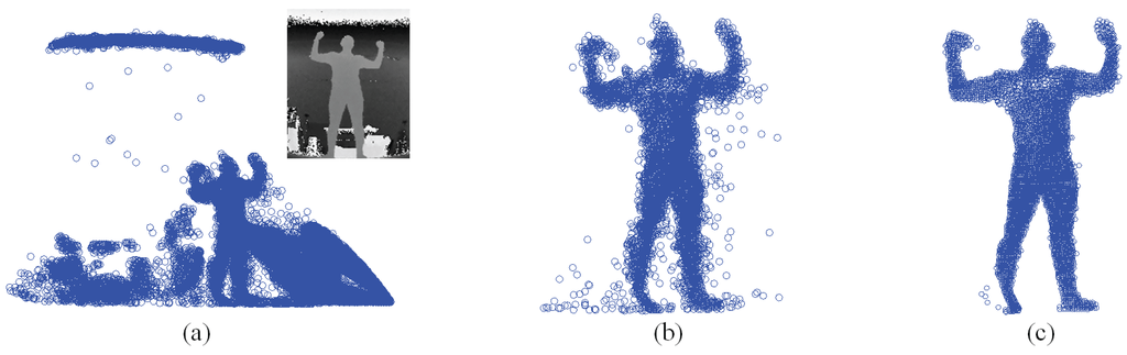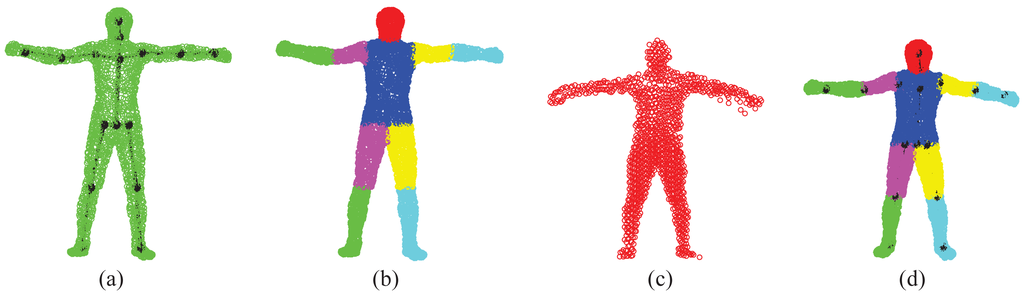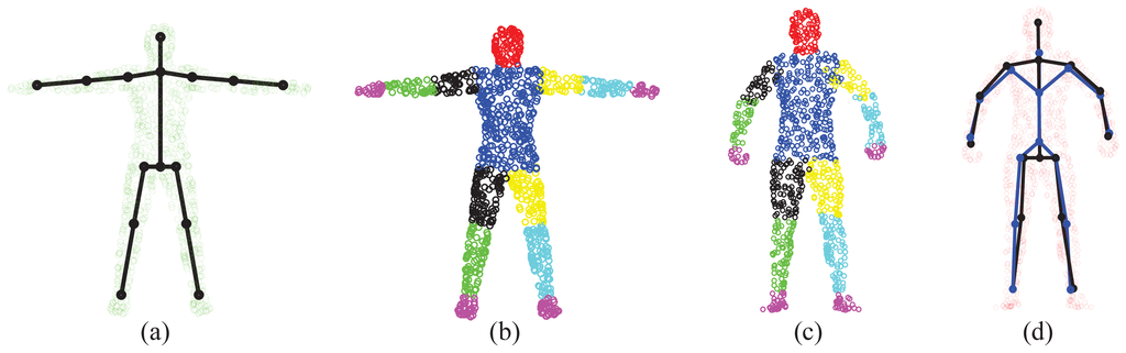 The SMMC-10 dataset contains 28 depth image sequences (numbered 0 to 27) from the same subject with different motion activities, and it provides the ground-truth marker locations. The input depth image cannot be used directly, due to noise/outliers and undesirable background objects. Therefore, we performed three pre-processing steps to make the depth data ready for pose estimation, which include body subtraction by depth thresholding, a modified locally optimal projection (LOP) algorithm for denoising [22] and outlier removal by limiting the maximum allowable distance between two nearest points. Figure 17 shows an example of depth pre-processing for the SMMC-10 dataset. The “T-pose” template (around 2000 points) in this experiment is from [22], which has a built-in skeleton (Figure 18a) along with labeled body segments (Figure 18b). We selected one depth image with “T-pose” from Sequence 6 for shape initialization, which is given in Figure 18c, and the learned subject-specific shape model with a baked-in skeleton and labeled segments is shown in Figure 18d.