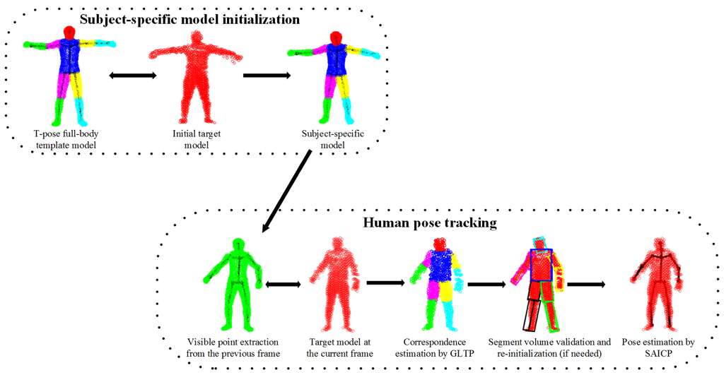 An overview of the proposed framework is shown in Figure 2, which involves five steps. First, we learn a subject-specific articulated model to initialize the body shape and size for a new subject. Second, visible point extraction is performed from the subject-specific model to create a partial template model, which either involves previous pose estimation or a “T-pose” template. Third, our recently proposed non-rigid registration algorithm (GLTP) is used for correspondence estimation from the observed target model. Fourth, segment volume validation is invoked to detect tracking failures and to trigger pose re-initialization if needed. Last, segment-aware AICP (SAICP) is used for articulated pose estimation by refining correspondence estimation at each segment iteratively. For 3D point sets, only Steps 1, 3 and 5 are needed; while for depth sequences, sequential pose tracking will involve all steps, and Steps 1, 2, 3 and 5 will support frame-by-frame pose estimation.