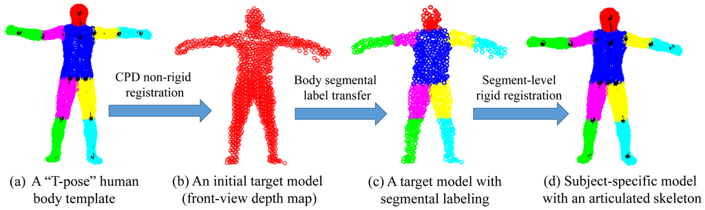 The objective of this step is to estimate correspondences between a labeled template point set and any target point set with an arbitrary pose. This is critical for latter SAICP-based articulated pose estimation. Because the subject-specific model Ẑ may not be in a strict fully-stretched “T-pose”, it may not serve as a good template here. Therefore, in the case of individual point set registration, we always use the standard “T-pose” template, where all body segments are fully stretched, as shown in Figure 3a. In the case of sequential depth data, we can either use the standard “T-pose” template for every frame by treating each frame independently or invoke a tracking strategy by creating a new template from the pose estimation result of the previous frame. The latter one is more computationally efficient, but must be accompanied with tracking failure detection and may require re-initialization if needed. As those used in Section 3.1, we still use Y and X to denote the template and a new target point set, respectively, in the following.