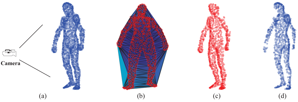 Visible point extraction is important to support depth map-based pose estimation, especially in the case of sequential depth data. This step requires the relative position between the full-body template model and the camera. In this work, we use the hidden point removal (HPR) operator [43] to detect visible points of a given template model. Given a point set A = {ai} and the viewpoint C (camera position), the HPR operator mainly has two steps to determine ∀ai ∈ A whether ai is visible from C. In the first step, we associate with A a coordinate system and set C as the origin. Then, we find the inverted point of each ai using spherical flipping [44] with the following equation: