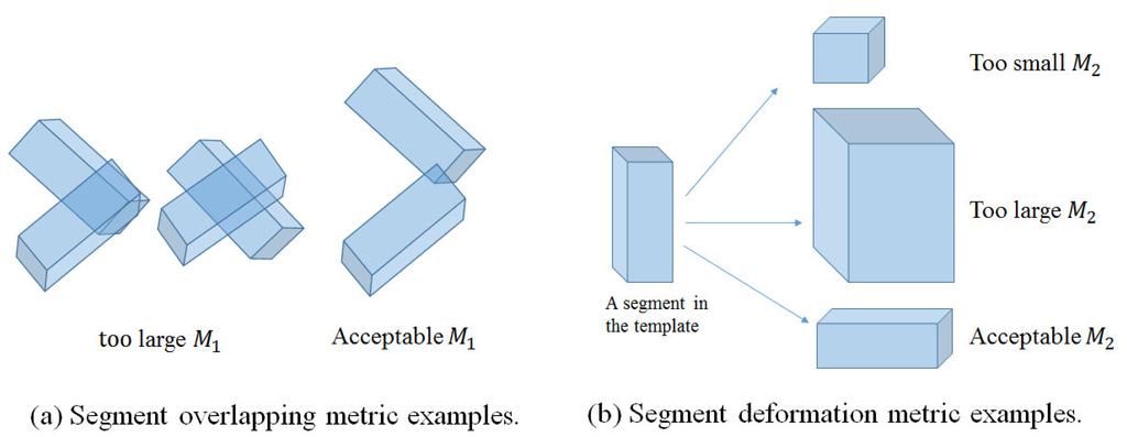 Segment overlapping metric (M1): This metric checks the overlapping ratios between every two body segments represented by OBBs in a labeled point set X̂ of P segments, as defined below: