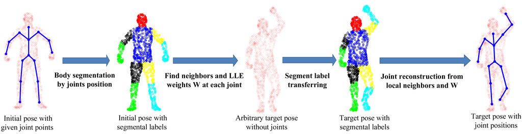 The SCAPE dataset contains a series of 3D scan data captured from one male subject (the only one publicly available under different poses), which are fully registered (the index of each point stays the same across all poses). It has one initial pose with ground-truth joint positions. To perform quantitative comparative analysis, we develop a simple, yet effective four-step approach to generate the ground-truth joint positions for all other poses, as shown in Figure 8. First, we perform body segmentation for the initial pose according to joint positions. Second, for each joint, we find a set of neighboring points around the joint area between two connected body segments and compute LLE weight coefficients to represent each joint locally. Third, we transfer the segmental labels from the standard pose for any new target pose. Fourth, we use LLE weight coefficients and the associated neighboring points, which share the same indexes as those in the initial pose, to reconstruct each joint position in the target pose. In this way, all poses will have the ground-truth joint positions created for performance evaluation.