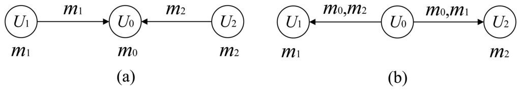 We first use a special case, the two-way relay channel, to illustrate the system model. We assume that there are three users U0, U1 and U2 in the network, and they have individual messages m0, m1 and m2 to share with the others. Without loss of generality, we choose user U0 to act as the relay. In the first phase, the users U1 and U2 transmit their messages m1 and m2, respectively, in turn to the relay node U0. We assume that both messages are received successfully by U0. In the second phase, i.e., the broadcast phase, the relay U0 transmits a codeword to both U1 and U2. The goal of the transmission from U0 is to convey the messages m0, m1 and m2 efficiently, so that U1 is able to reliably decode the messages m0 and m2 and U2 is able to reliably decode the messages m0 and m1. Eventually, all three users share the three messages in the network. The channel model is illustrated in Figure 1. This model is recognized as the two-way relay channel with a common message in [6].