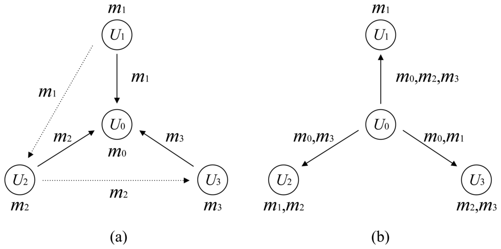 In the following, we extend the model to the multiway relay channel with full data exchange. We assume that a number of K users {U0, U1, …,Ul, … Uk– 1 } form a network. Each user Ul has an individual message ml to share with the others, for 0 ≤ l ≤ K ‒ 1. One of the users, for example U0, is assigned as the relay node. In the first phase, all of the users, except the relay U0, send out their messages in a time-division manner. During this procedure, each message ml, 1 ≤ l ≤ K – 1, is successfully received by the relay and may be received by other users. In the second phase, the relay U0 has the task of broadcasting a set of messages
