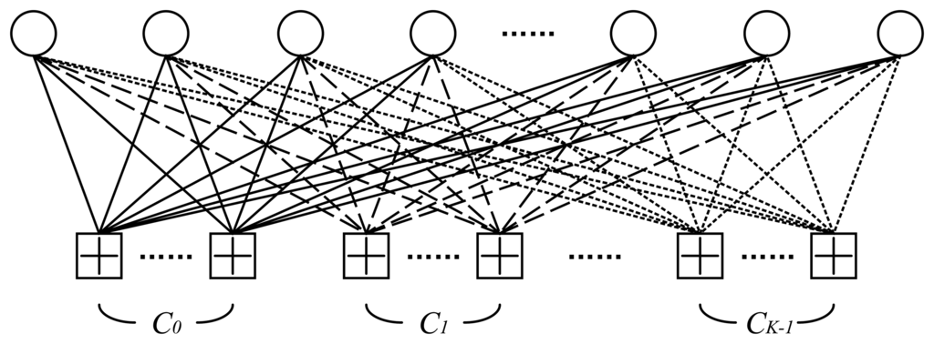 An MET nested LDPC code can be illustrated by the Tanner graph in Figure 3. The bit vector associated with the variable nodes V, i.e., the codeword, is denoted by X. There are K types of check nodes in the graph, C0, C1, …, Cl …, Ck−1. The parity-check matrices, which correspond to the K types of edges connecting the variable nodes and the different types of check nodes, are denoted by H0, H1, …, Hl, …, Hk-1, and have variable and check node degrees (dv0, dc0), (dv1, dc1), …, (dvl, dcl), …, (dvk−1, dck−1), respectively. The MET nested LDPC code can be described by the stacked parity-check matrix H, and we have: