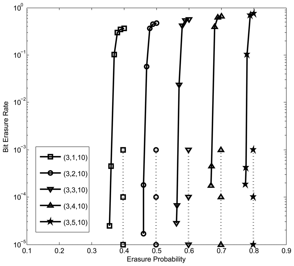 {0,1} for the performance evaluation. We set the parameters as dV0 = 3, dc = 10, w = 3 and L = 100. Different variable degrees dV1 ∈ {1,2, 3, 4, 5, 6} are used to realize different sum rates R0 + R2, where the tradeoff between R0 and R2 is controlled by dV2, which is upper bounded by dV2 ≤ dc − (dV0 + dv1) (see also Equations (4)–(6)). The results over BECs are summarized in Table 1. For the purpose of comparison, we also provide in Table 2 the results for regular LDPC block codes with the same node degrees. For each given degree setup, we calculated the gap between the Shannon limit and the BP threshold, which indicates how far the achievable rate at U1 is from the boundary of the capacity region.