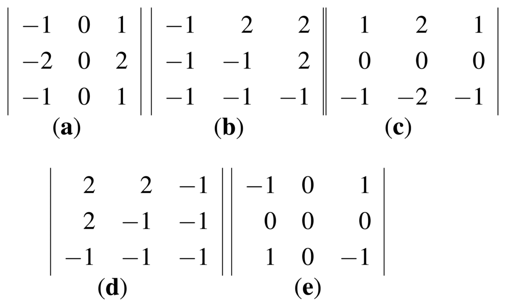 The proposed variant of EOH utilizes the Sobel operator in Equation (11), and SIFT, PIIFD and NG-SIFT utilize the filters [−1, 0, 1] and [−1, 0, 1]T to calculate the horizontal and vertical directional derivatives.
