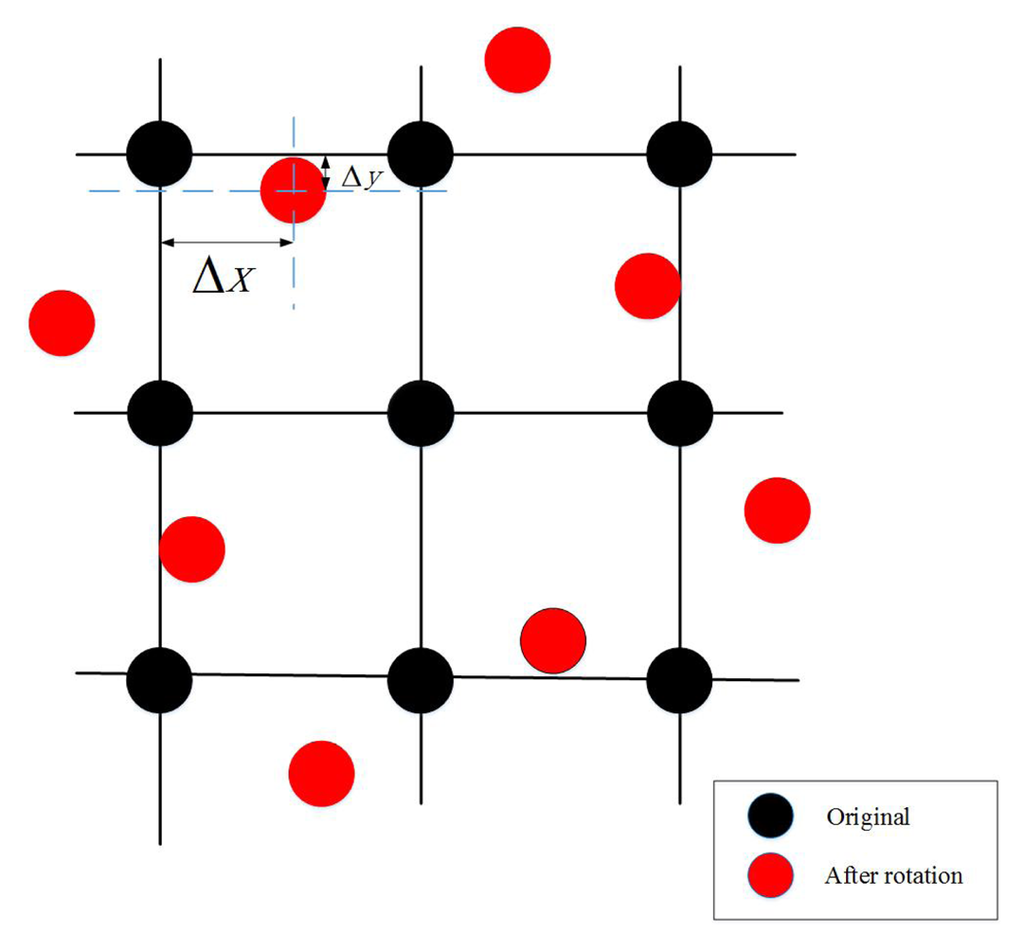 When main orientation is assigned to a keypoint, we need to compute the maximum response of the five filters. The five filters are rotated by the amount of main orientation, and the rotated pixels for computing the filter response lie in a fractional grid, as shown in Figure 2. To obtain pixel values at the fractional grid, a bilinear interpolation is employed.
