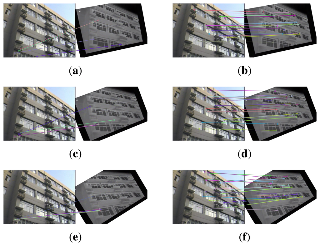 This section gives visual matching results. Figure 3 gives the keypoint matchings built with the original EOH without the main orientation and the proposed method. The visible image serves as the reference image, and the infrared image is used as the test image. The test image is rotated by 10°, 20° and 30°. Figure 3a,c,e show the matching result of EOH between the reference and the rotated test image by 10°, 20° and 30°, respectively. Due to the lack of main orientation, the keypoint matches built with the EOH contain very few or no correct matches. As a comparison, the proposed method provides sufficiently many correct matches in Figure 3b,d,f.