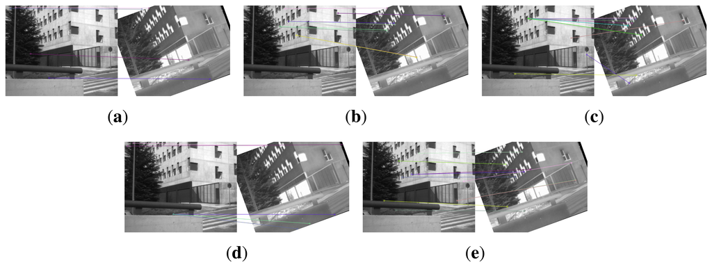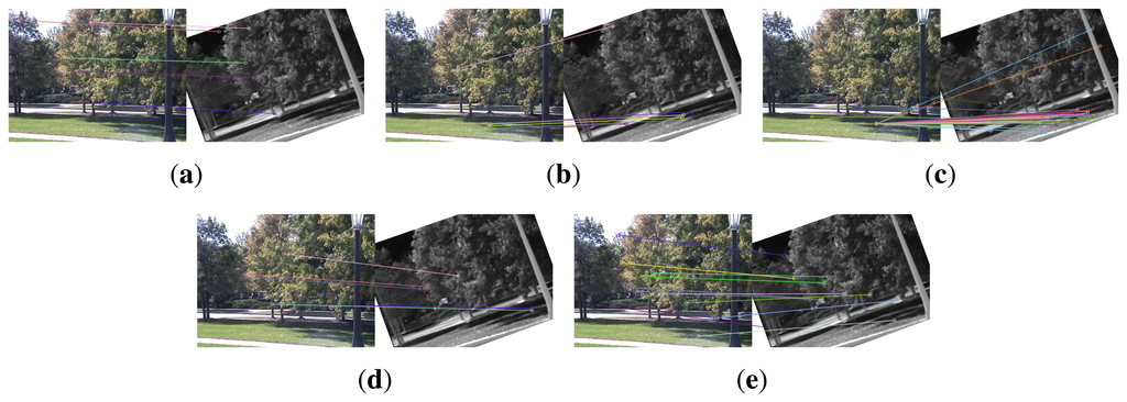 Figure 5 illustrates the keypoint matches on an image pair from dataset VS-LWIR built with EOH, EOH equipped with SIFT main orientation, COM main orientation, HOI main orientation and the proposed method. The performance of EOH and EOH equipped with SIFT main orientation in Figure 5a,b is inferior to that in Figure 4a,b. The performance of COM and HOI is not good either, as shown in Figure 5c,d. This image pair is taken with a visible camera and an LWIR camera. The multimodality between them causes the inaccuracy of SIFT main orientation, COM and HOI and, hence, the mismatches in Figure 5b–d. The proposed method, for the induction of main orientation to keypoints, performs still well on this image pair.
