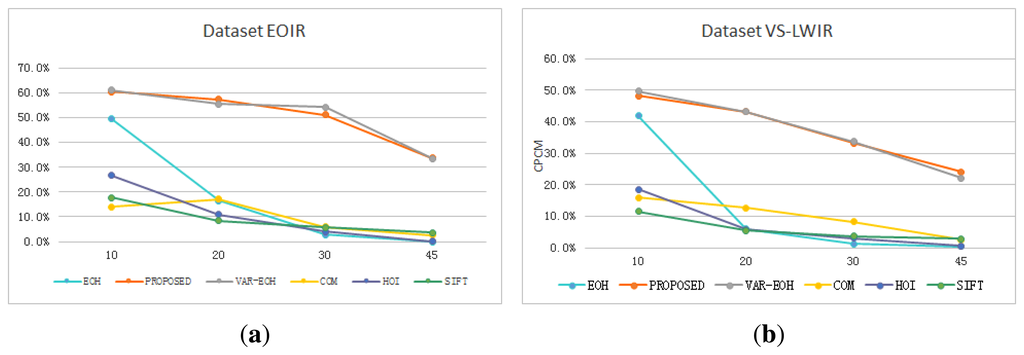 The variant implementation of EOH with the main orientation performs comparable to the proposed method that utilizes the five filters in Figure 1. On dataset VS-LWIR, the variant gives 18.55% of matches falling in [0, 5] when the rotation is 20°, and the proposed method gives 16.50%. When the rotation gets to 45°, the variant gives 11.79%, and the proposed method gives 12.35%. It can also be observed from Figure 6 that the variant EOH proposed in Section 2.3 performs as well as the proposed method. From Tables 1 and 2, we can conclude that the proposed variant implementation of EOH can yield keypoint matches as reliable as the EOH assigned to the main orientation. This explains and verifies that the non-direction bin does not have a great effect on the matching ability and is not used in descriptors, such as SIFT, SURF and PIIFD.
