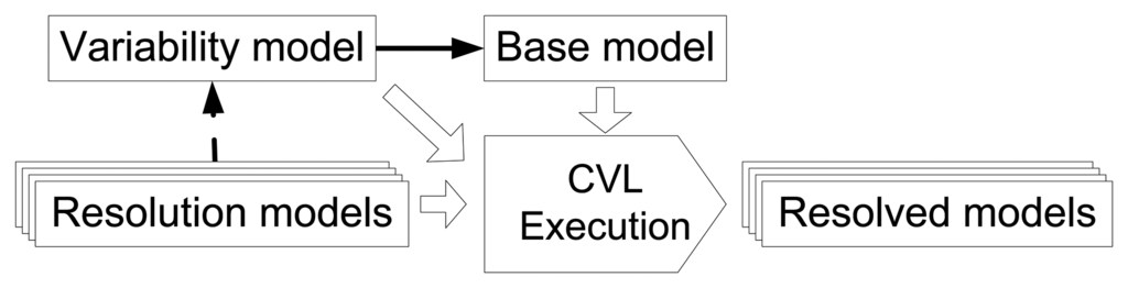 Once the variability model and the base model have been defined, a set of VSpecs are selected from the VSpec tree. This selection of VSpecs is referred to as the resolution model. Then, the CVL tool is executed, and it obtains the resolved model, a product model, fully described in the MOF-based metamodel, which is a variation of the base model according to the choices that have been made in the resolution model.