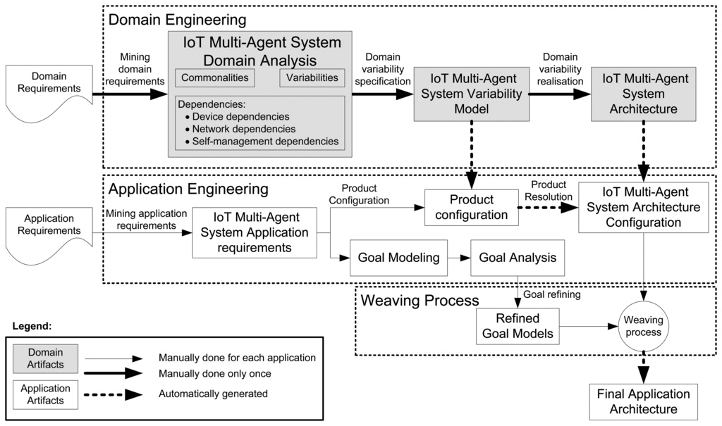 As stated in the Introduction, our goal is to develop an appropriate reuse mechanism to develop a family of systems in the IoT, paying particular attention to the inherent variability of IoT systems and in their self-management. Specifically, we propose an SPL process for Self-StarMAS agents instantiated for CVL (the process is shown in Figure 2). A typical SPL process comprises two phases, namely the domain engineering and the application engineering. Our domain engineering phase, which is done once, defines and realizes the commonality and the variability of multi-agent systems in the IoT as an SPL. On the other hand, the application engineering phase of the SPL deals with the multi-agent system-based applications for the IoT, which are designed and built by reusing domain artifacts and exploiting product line engineering [] from the previous process. Our SPL process (see Figure 2) introduces an extra process, called the weaving process, that weaves the goal model of the agents with the architecture generated in the application engineering phase. Therefore, in order to apply our proposal, agent developers only have to focus on the application engineering process. In this phase, they use application requirements to accomplish two tasks, the selection of a product configuration of the SPL and the modeling and analysis of the agent goals. The final application architecture is automatically derived from these models.