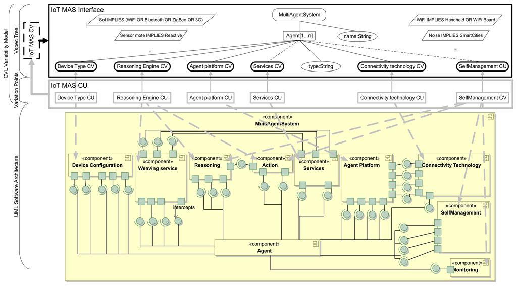 This section describes the first phase of our SPL process, the domain engineering phase (see the top of Figure 2), which identifies and models the agents for the IoT, their commonalities and variabilities, as well as the dependencies between them. As stated, this phase is accomplished using CVL, and our MOF-based language is the Unified Modeling Language []. This phase is divided into three different processes: IoT multi-agent system domain analysis, generation of the IoT multi-agent system variability model and definition of IoT multi-agent system architecture.