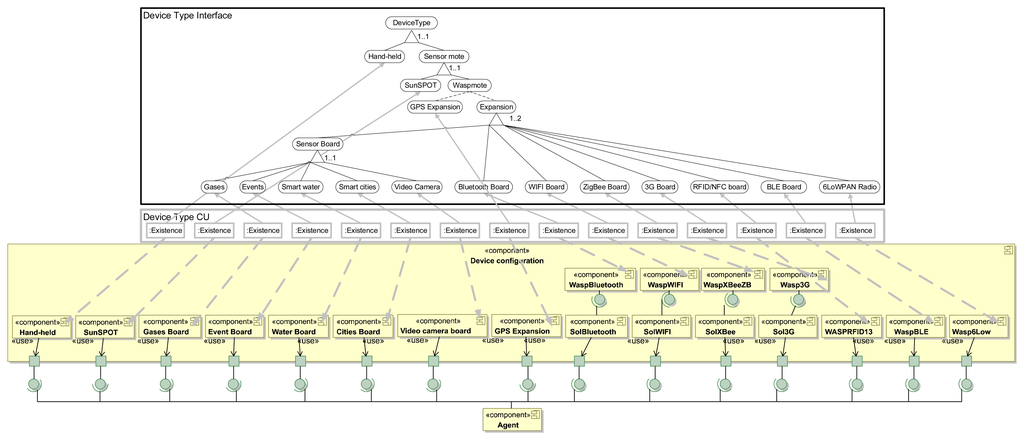 The detailed architecture of Device configuration is depicted in Figure 4, where each concern (e.g., Hand-held) is modeled with a UML component, and its dependencies are modeled using classical, provided required interfaces. Self-StarMAS agents have different options for the configuration of the device in which the agent is embedded. Agents can be embedded in Hand-held devices, SunSPOT sensor motes and Waspmote. Hand-held and SunSPOT do not have special options for their configuration. However, we model the architecture of Libelium waspmote that considers expansions for different networks technologies (e.g., WaspWiFi, WaspBluetooth or WASPRFID13) and sensor boards (e.g., Gases Board or Cities Board). In addition, Device configuration includes components to communicate the agent with the agent platform using available technologies, SolBluetooth, Sol3G, SolWiFi and SolXBee. These components require services provided by the corresponding component that encapsulates the technology used to communicate with the agent platform. For instance, SolBluetooth requires functionality provided by WaspBluetooth.