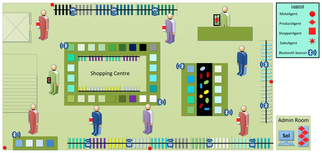 Our case study focuses on a single store (see Figure 5); BLE Beacons are spread over the different elements of the shop associated with specific categories of products and special offers. When a customer with a smartphone is close to a beacon (and also a category of products or a special offer), the device receives a (context-aware) recommendation. The salespeople also benefit from the technology around them. Store employees are informed of the position of customers in the store and receive information of the environmental conditions of the shop in real time on their hand-held devices. This system has been designed as a multi-agent system composed of agents embedded in the different devices that comprise the application. There are agents embedded in sensor motes (which provide the environmental conditions of the store), in the personal devices of the users (both customer and employees) and in the computer of the manager of the shop. In order to enable the communication between these heterogeneous agents, we use the Sol agent platform [], which is running in the aforementioned computer. These four types of agents in our case study (MoteAgent, ProductAgent, ShopperAgent and SalesAgent) are used henceforth to illustrate different processes and steps of the application engineering of our SPL process.