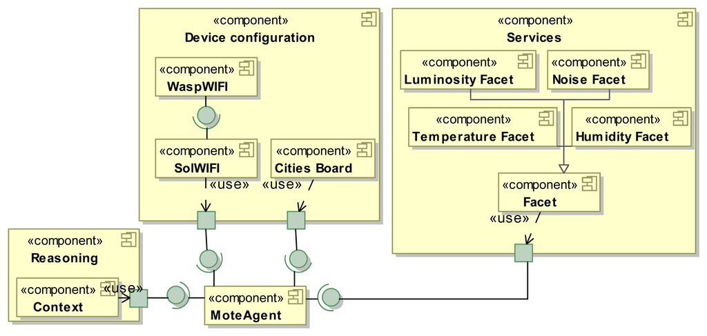 Figure 6 depicts the resolved model for MoteAgent. Architectures for sensor motes usually comprise a few components according to the computational and memory capacities of these devices. This architecture configuration includes the architectural components to deal with the monitoring of the luminosity, noise, temperature and humidity. To do so, it has facets to perform tasks for the monitoring (e.g., Luminosity Facet) and the Cities Board that provide the libraries to perform such tasks. This information is stored in the Context component of the MoteAgent. Additionally, in order to deploy the agent in the Sol agent platform using the Wi-Fi wireless technology, its architecture includes WaspWIFI and SolWIFI.