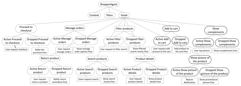 Goal modeling and analysis processes focus on the application specific goals and use the logic-based techniques available in SPL tools, like SPLOT [], to check consistency and detect conflicts between agent goals. Using SPL tools, we can detect inconsistencies between goals and contexts. Additionally, using resolution models (see Section 3), we can detect conflicts between goals and plans. Therefore, in this case, the SPL is used just as an analysis tool, not for developing the system. This procedure allows the software architect, who is familiar with SPL and CVL, to analyze agent goals without requiring any extra knowledge or external tools. Therefore, this process is only applied to each agent that has a goal-oriented reasoning engine. The output of the goal modeling and analysis processes (the refined goal model in Figure 2) is an SPL that contains a set of goals, plans and context of the agent that is consistent and whose conflicts are detected. Figure 7 depicts a partial view of the goal model of ShopperAgent, which follows the semantics of CVL. Due to limitations of space, in Figure 7, only the goals of the ShopperAgent are depicted. In the last phase of our development process, the refined goal model is weaved with the IoT multi-agent system architecture configuration to obtain the final application architecture (see Figure 2). To do so, a model-driven development process implemented using the ATLASTransformation Language (ATL) [] is used [].