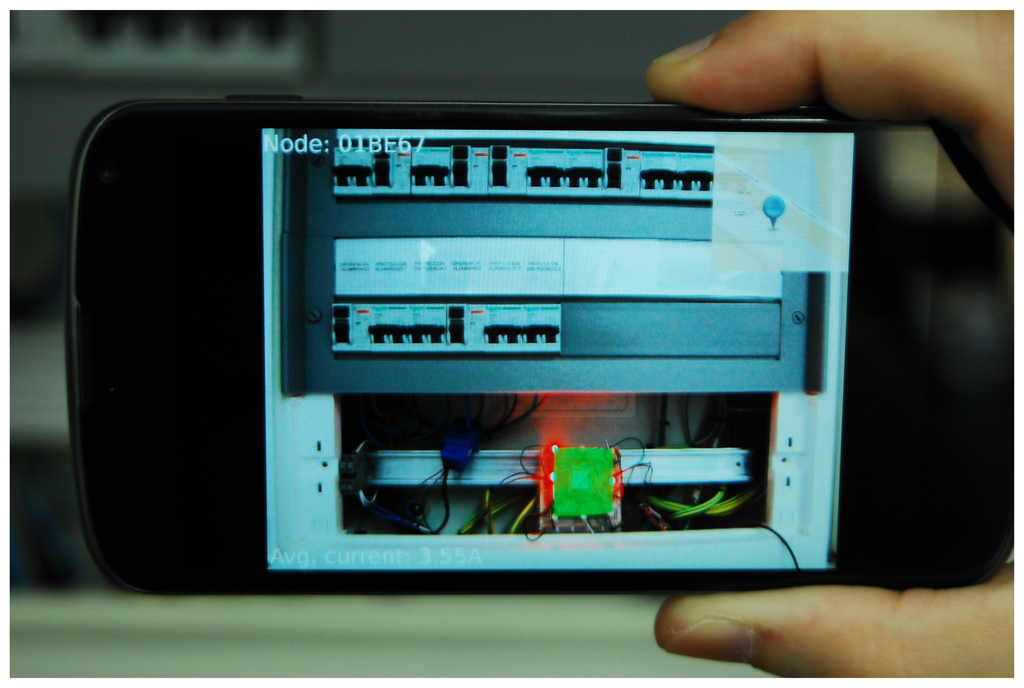 In the next step, we connected the test nodes to the electrical panels of a building using amperometric clamps to measure the total intensity of current flow. These nodes were equipped with prototypes of dynamic AR markers, allowing us to deliver basic information about the connections to an Android AR application (Figure 15).